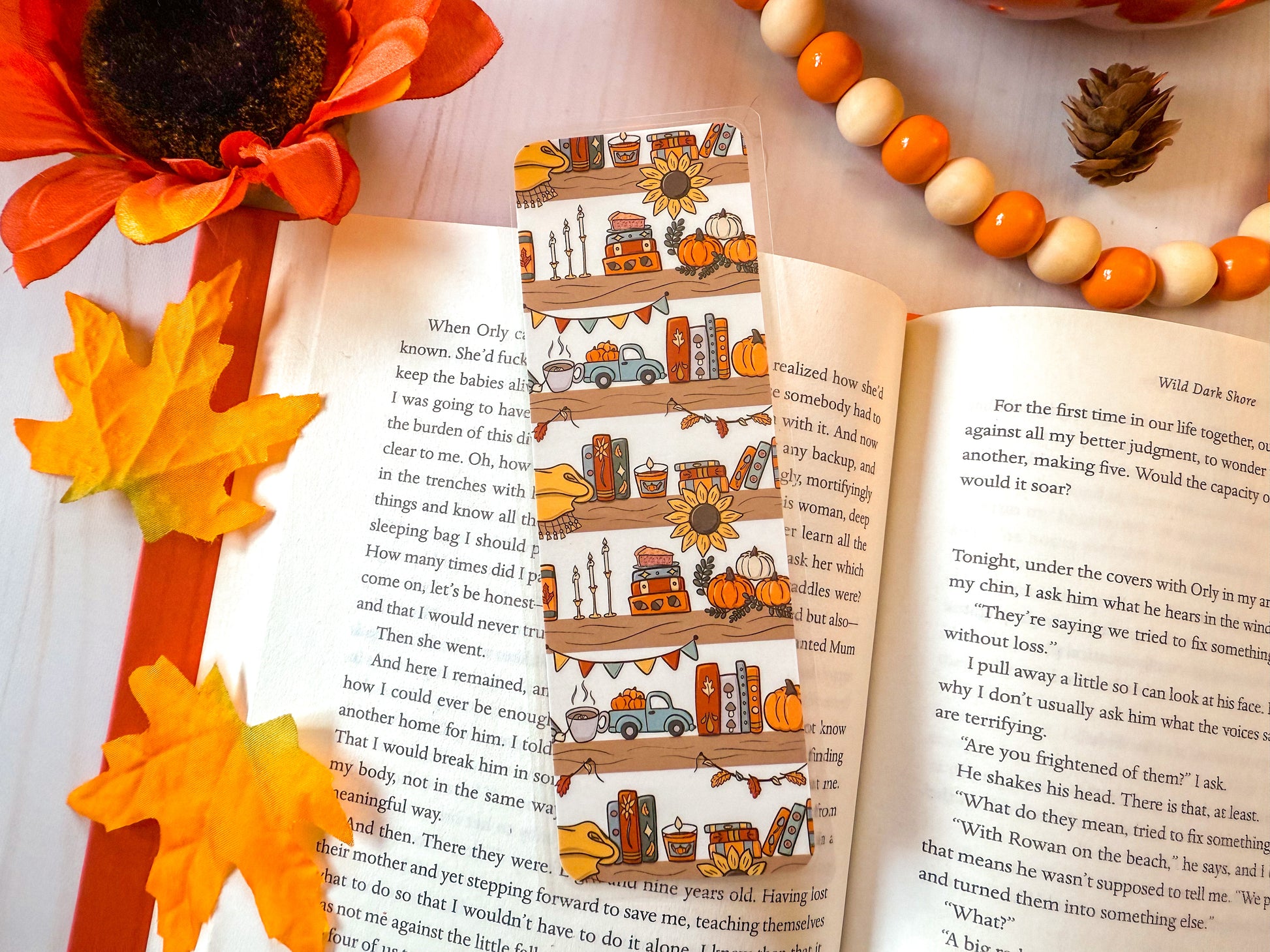 Fall Farmhouse Bookshelf Bookmark – Stacked with books, candles, sunflowers, and pumpkins, this design celebrates the ultimate cozy reading nook.