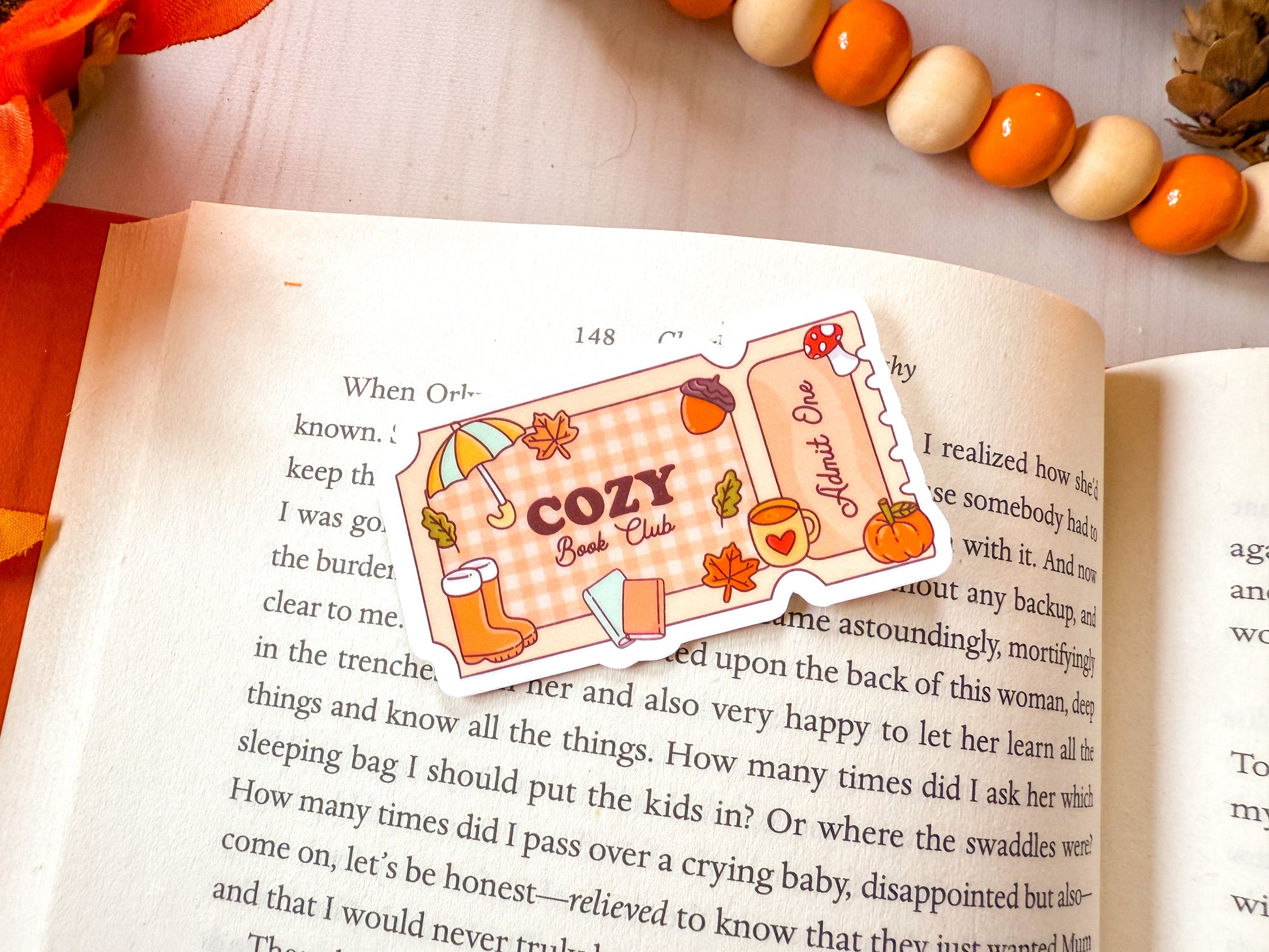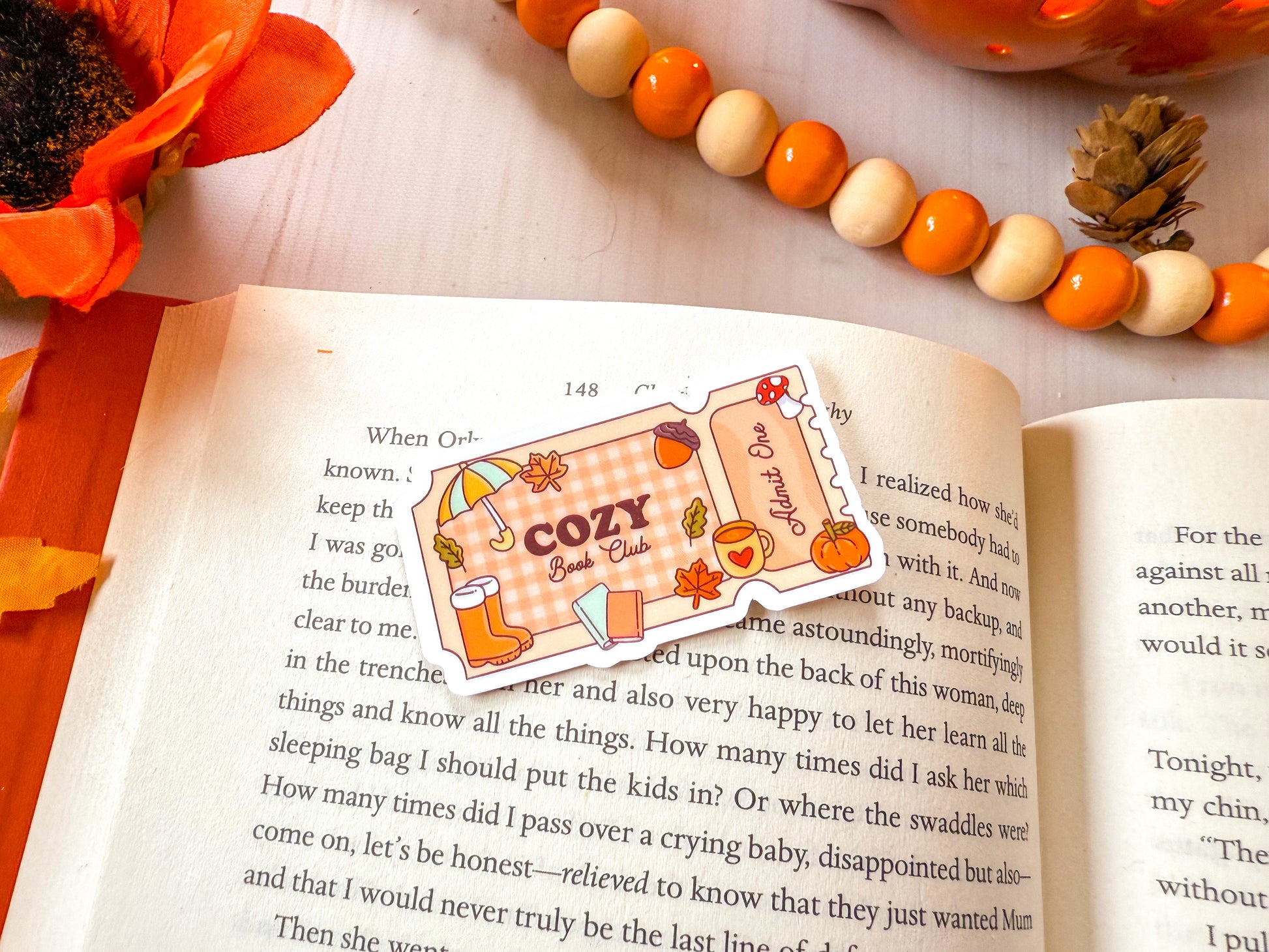 Grab your Cozy Book Club Ticket sticker today and bring bookish charm to all your favorite things.