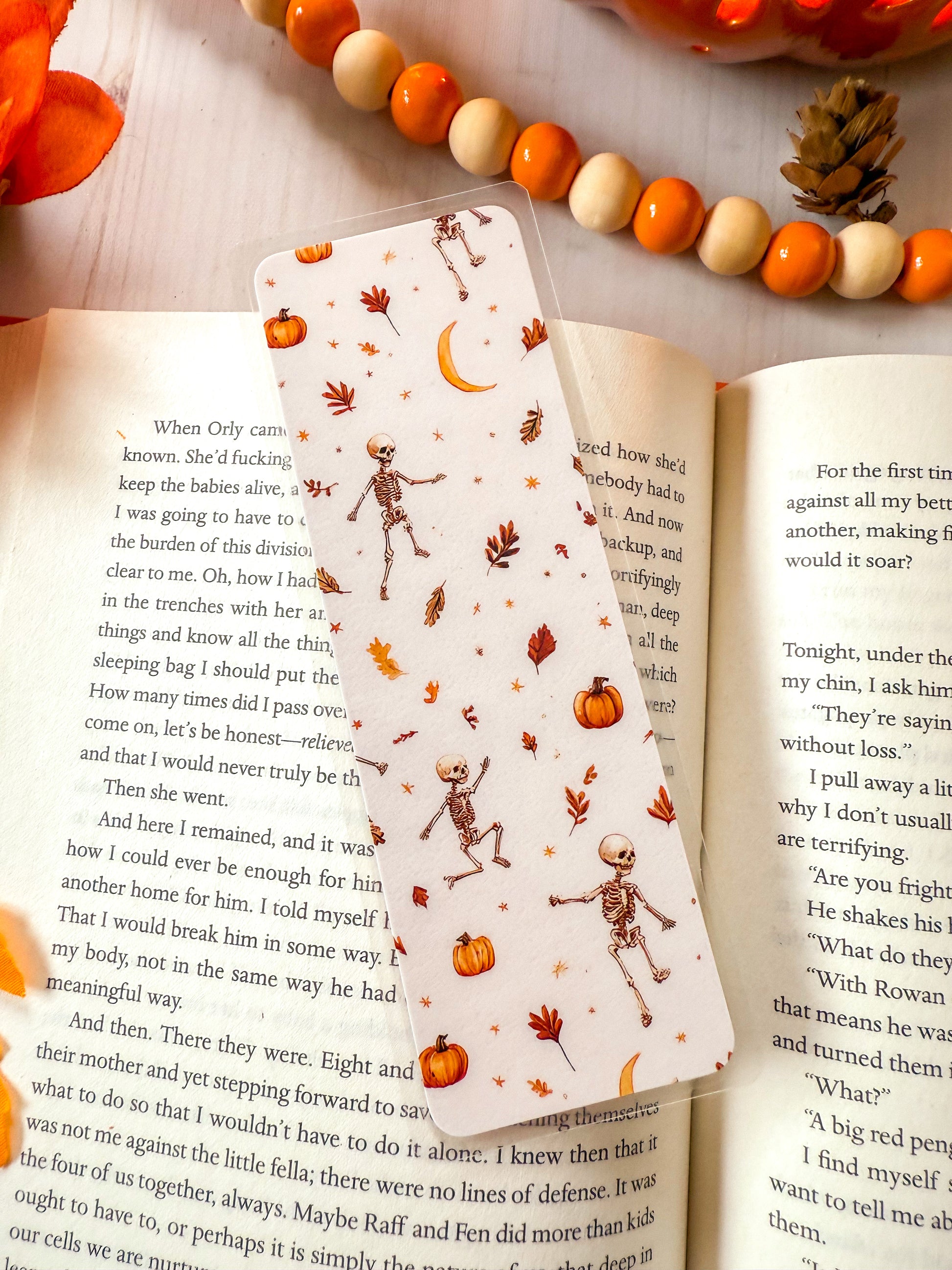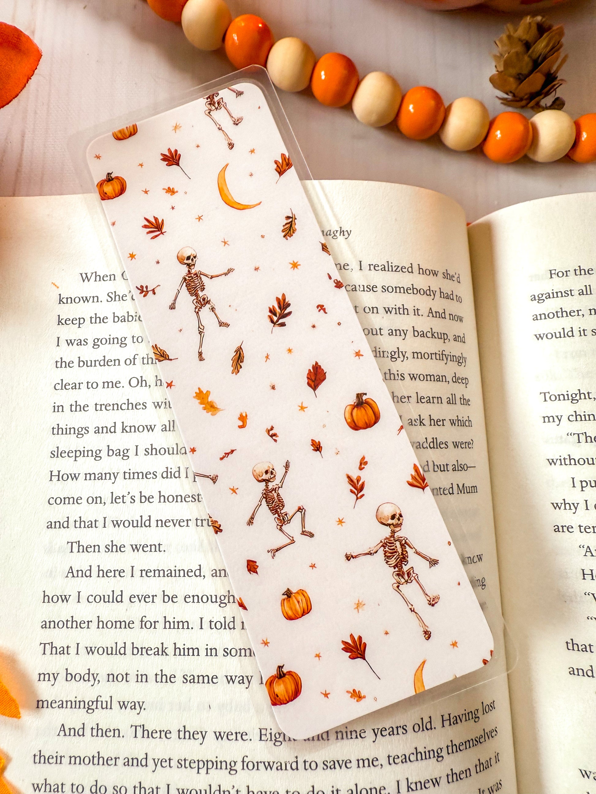 Bring a little spooky fun to your reading this season with our Dancing Skeleton Halloween Bookmark! This laminated fall bookmark features playful skeletons surrounded by pumpkins, autumn leaves, and a glowing crescent moon – the perfect mix of spooky and cozy for your Halloween reading stack.